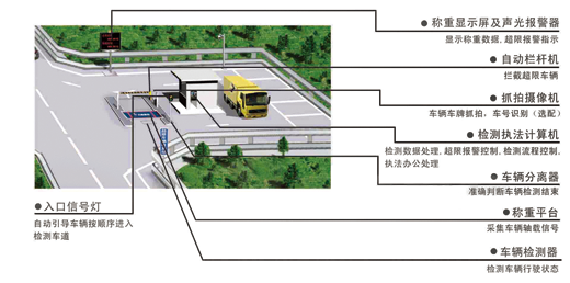 ◆ 公路低速動靜態稱重系統主要由 1 套低速動態稱重系統、 2 個線圈、 1 個輪胎識別器(可選)、聲光報警顯示屏構成。