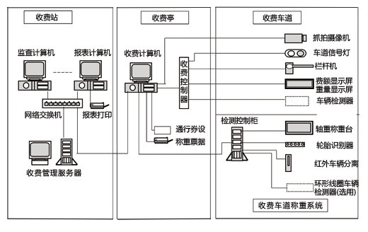 為了在收費站實現計重收費和超限檢測功能,在收費車道前置安裝一臺收費車道低速高精度稱重系統,向收費系統計算機傳輸軸重、整車重、車速、車軸數量、車型、軸距、速度、車道號和行駛方向、日期和時間、數據記錄序號、車輛加速度、超限判別標識等信息,實現計重收費和超限檢測功能。