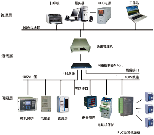 系統(tǒng)由管理層、通訊層、間隔層構(gòu)成。管理層由工作站、服務(wù)器等硬件系統(tǒng)和操作系統(tǒng)、應(yīng)用軟件等軟件系統(tǒng)組成;通訊層包括通信管理機,交換器,通訊線組成,將所有監(jiān)控終端的數(shù)據(jù)進(jìn)行收集,并送入管理層數(shù)據(jù)庫進(jìn)行分析和加工;間隔層由各種中壓保護(hù)監(jiān)控裝置、低壓測控裝置、低壓測控儀表組成。