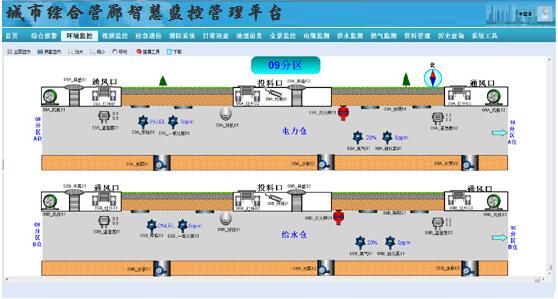 通過在每個防火分區內出入口和通風口處安裝氣體(O2、CH4、H2S)、溫度、濕度、煙霧、水位、水浸等監測傳感器,可實現與風機、水泵的自動化控制與對接,檢測信號就近送附屬設備監控系統現場控制單元,并通過以太網送到監控中心計算機。在監控中心控制室顯示屏上,以數字形式顯示每個防火分區的氧氣百分比含量和溫度/濕度。